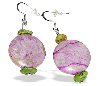 These unique earrings display pink round dyed howlite and green mohave tumbles. 1.5 inches measured without earwire. Stone sizes are 24 mm and chips approximately 5 x 9 mm. Original designed in Austin, Texas. Nickel-free (not stamped silver) earwire.