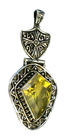 HUGE faceted Citrine stone 1-inch long, set in medieval style silver frame hinged to shield design bail. Fit for a queen - or king!